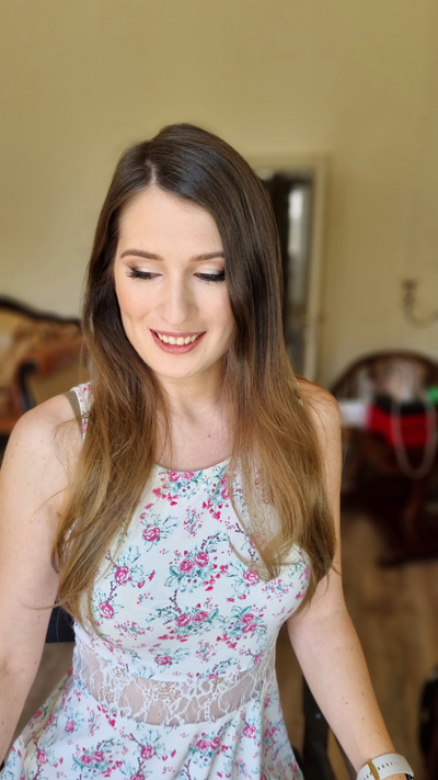 A menyasszonyi smink nálam nagyon aprólékos, hosszabb munkafolyamat, vagyis sokkal több figyelmet, precizitást igényel, ezáltal picit magasabb a belekalkulált munkadíj. Időben kifejezve kb 20-40 perccel hosszabb ideig foglalkozok egy menyasszonyi smink elkészítésével, mint egy alkalmi sminkkel.